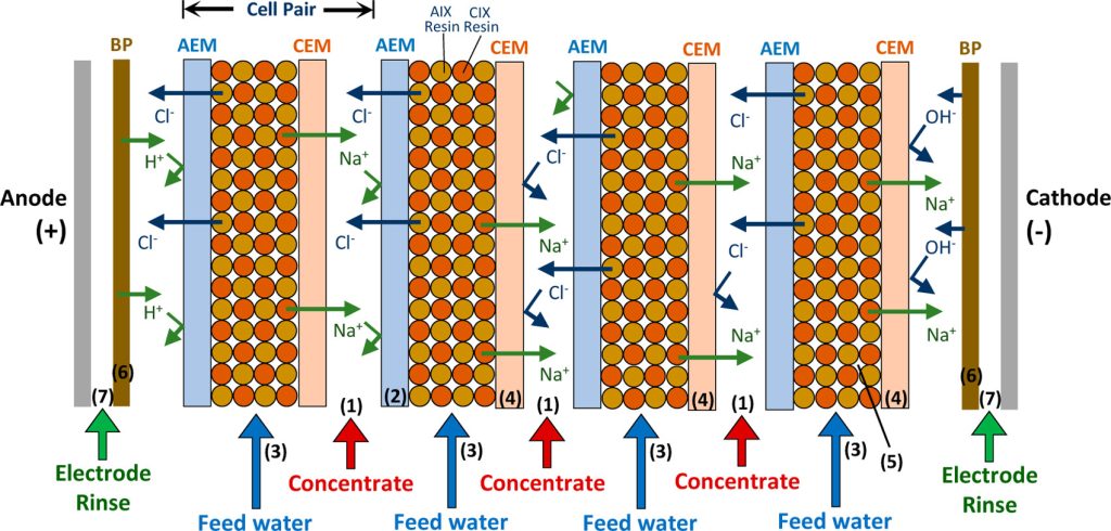 این فرآیند یک گرادیان غلظت را در جهت جریان آب ایجاد میکند و اجازه میدهد تا جریان (ولتاژ) بر اساس نیازهای ورودی و خروجی برای تولید آب خالص و بدون یون تنظیم شود. غشاهای انتخابی یونی مانع از ورود یونهای ناخالصی موجود در محفظه پساب به محفظه آب تصفیه شده مجاور میشوند.